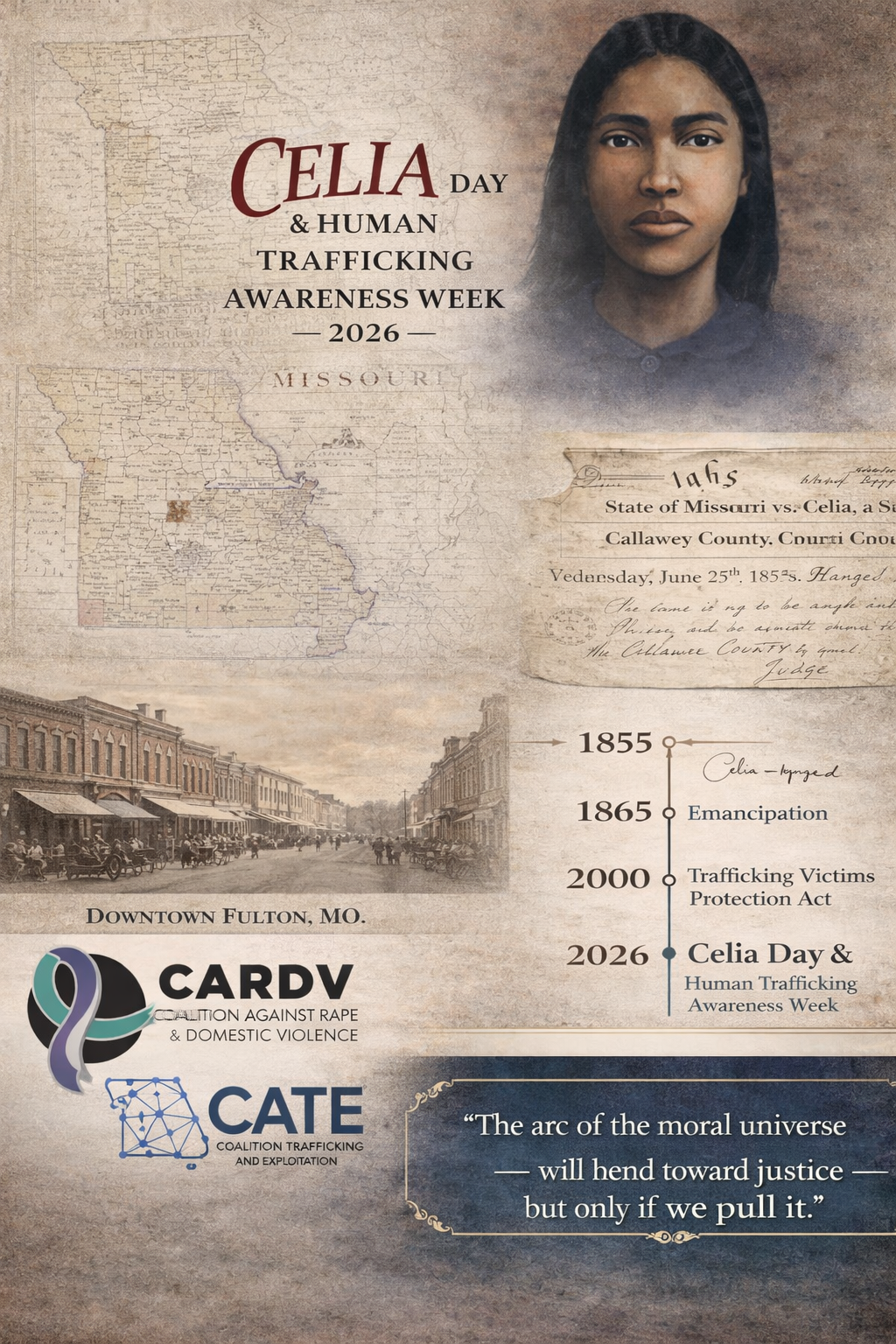 Observed during Sexual Assault Awareness Month (SAAM), the week honors the legacy of Celia by connecting Missouri’s history of sexual violence to present-day exploitation. In partnership with the State Historical Society of Missouri, the Coalition Against Rape & Domestic Violence (CARDV), the Coalition Against Trafficking & Exploitation (CATE), the Missouri History Museum, the Crime Victim Center of St. Louis, and community partners statewide, this initiative transforms historical truth into education, accountability, and survivor-centered action.